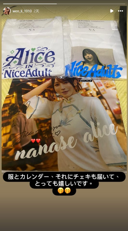 This collaborative T-shirt commemorates Alice Nanase's appearance on the NiceAdult channel. It will be available only during the video streaming period. N/A brand print name will be embroidered on the front hem. There is no back print. It will be a big silhouette type T-shirt with a large and firm fabric. The product will be shipped within 5 business days from the date of order.