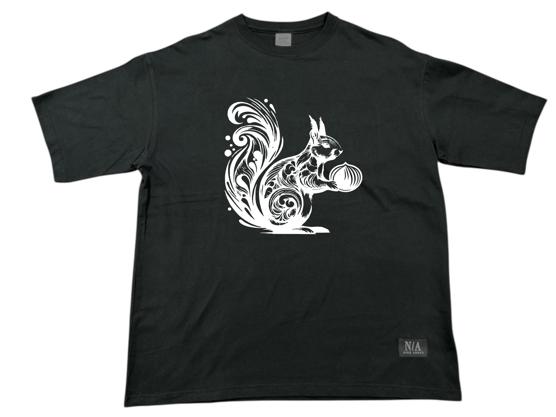 栗を持ったリスの定番デザイン。フロントの裾にN/Aブランドのプリントネームの刺繍が入ります。バックプリントはありません。ビックシルエットタイプの大きめで生地のしっかりとしたTシャツとなります。ご注文から5営業日以内での発送となります。