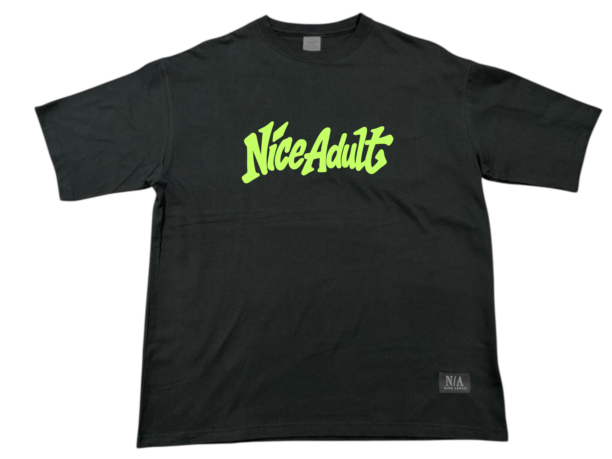 NiceAdultの新しいブランドロゴのライムカラーバージョンとなります。フロントの裾にN/Aブランドのプリントネームの刺繍が入ります。バックプリントはありません。ビックシルエットタイプの大きめで生地のしっかりとしたTシャツとなります。ご注文から5営業日以内での発送となります。