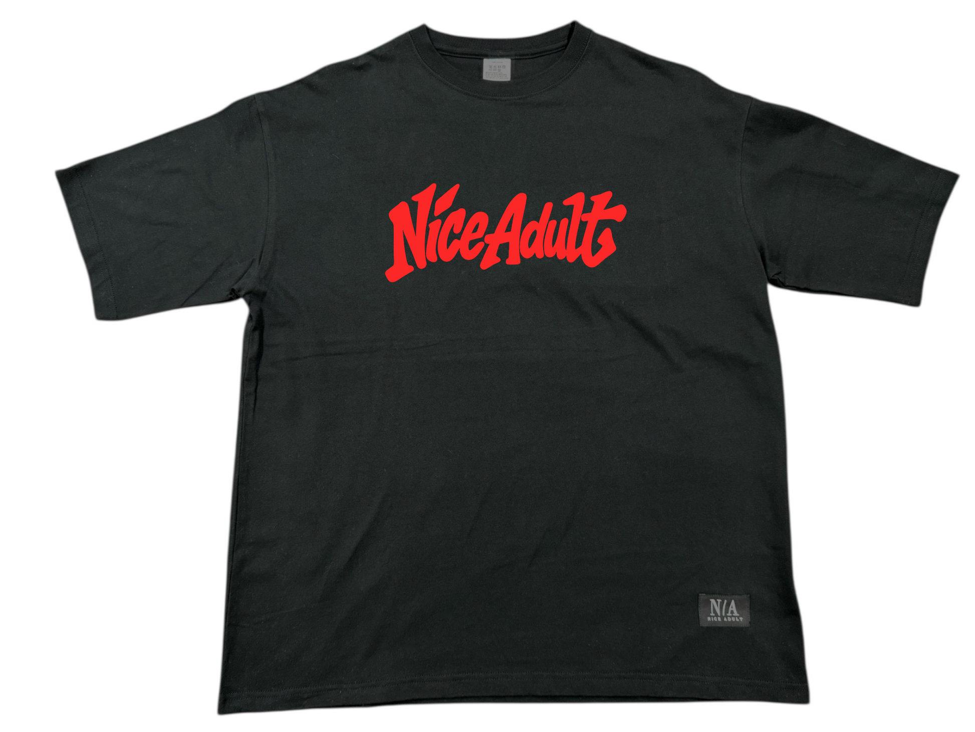 NiceAdultの新しいブランドロゴのREDバージョンとなります。フロントの裾にN/Aブランドのプリントネームの刺繍が入ります。バックプリントはありません。ビックシルエットタイプの大きめで生地のしっかりとしたTシャツとなります。ご注文から5営業日以内での発送となります。