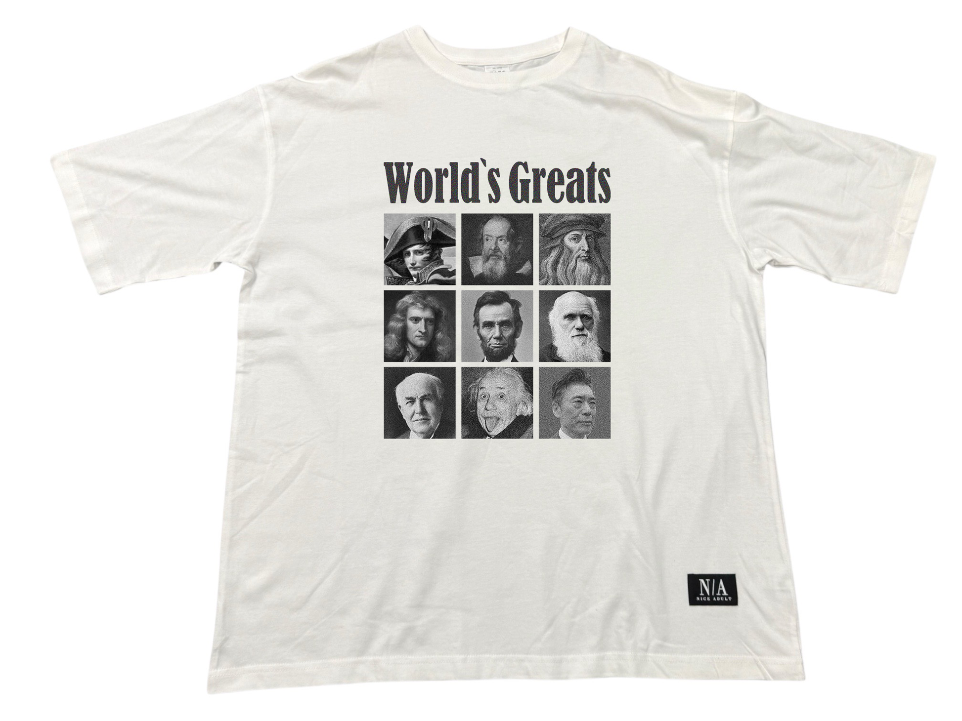 The design is based on "The World's 9 Greatest Historical Figures. N/A brand printed name embroidered on the front hem. There is no back print. This T-shirt is a big silhouette type with a large and solid fabric. It will be shipped within 5 business days from your order.