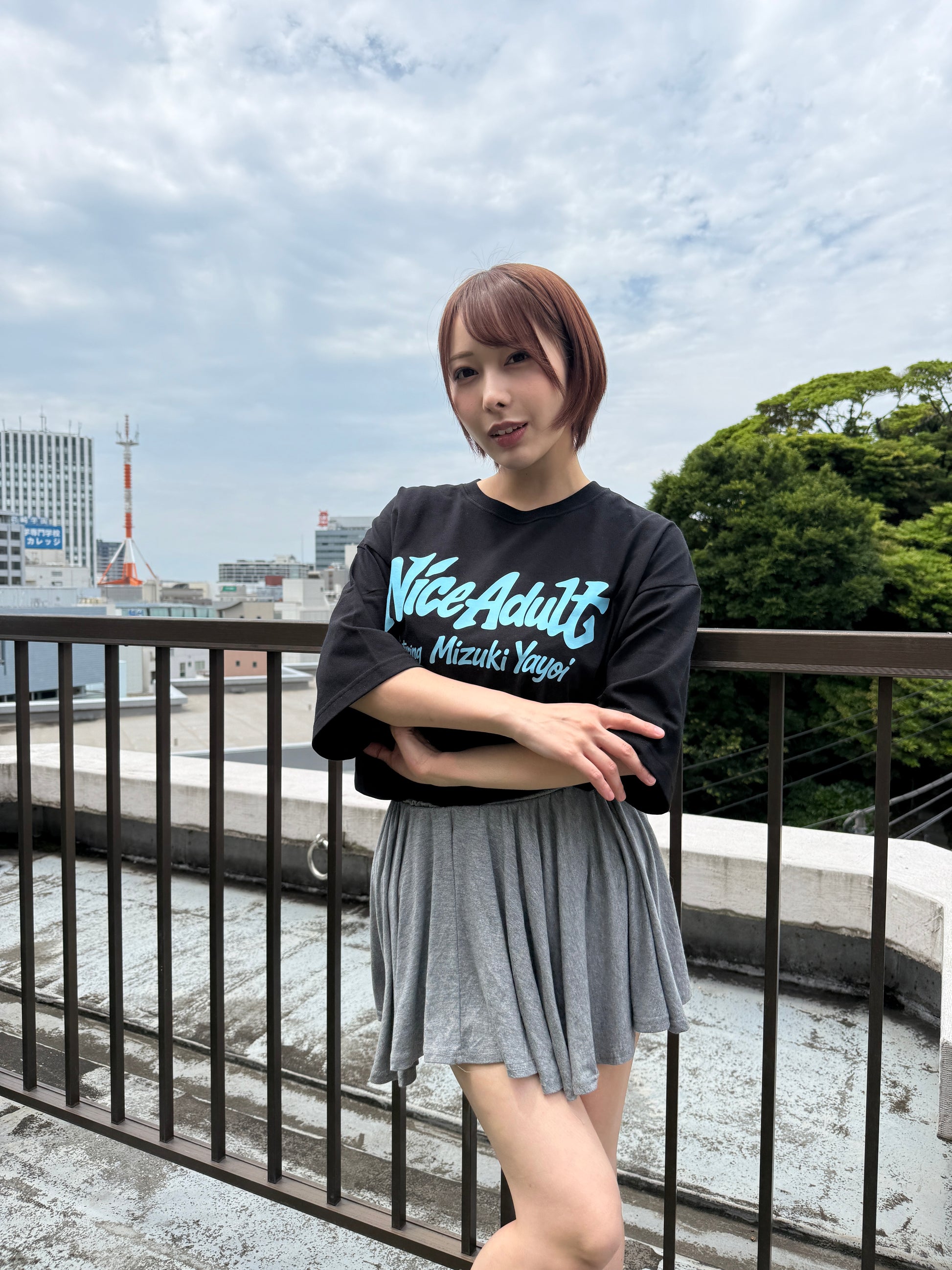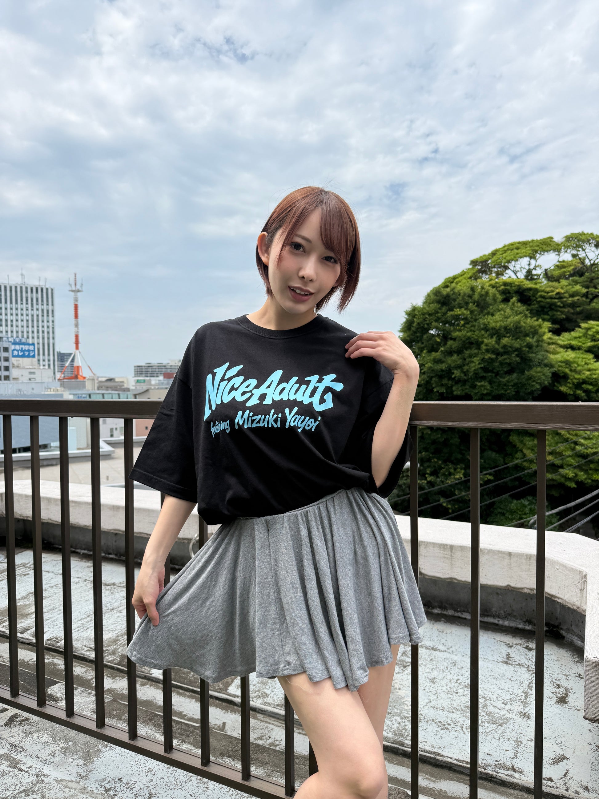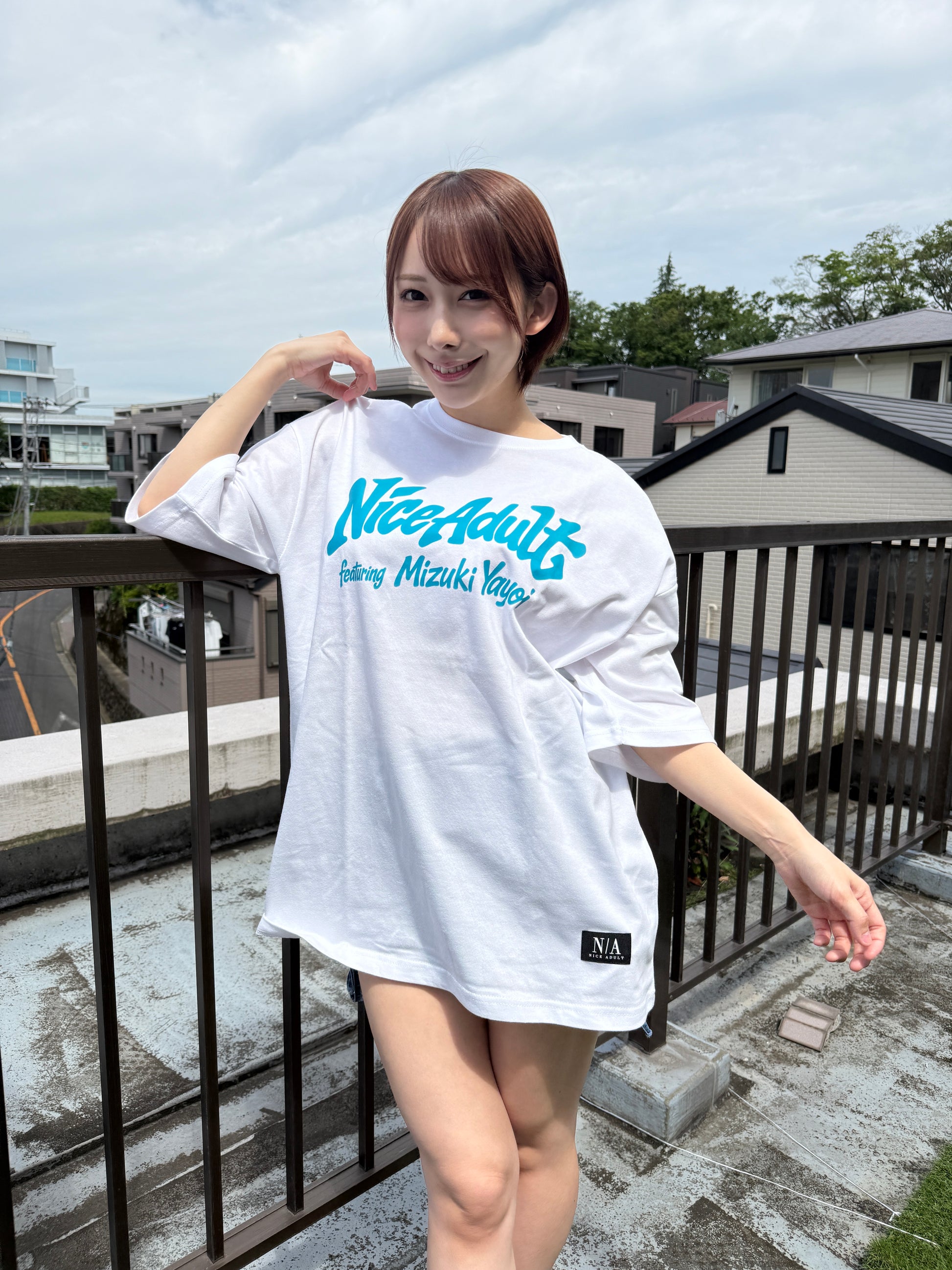 This collaborative T-shirt commemorates Mizuki Yayoi's appearance on the NiceAdult channel. It will be available only during the video streaming period. N/A brand print name will be embroidered on the front hem. There is no back print. It will be a big silhouette type T-shirt with a large and firm fabric. The size worn in the photo is size L. The product will be shipped within 5 business days from the date of order.
